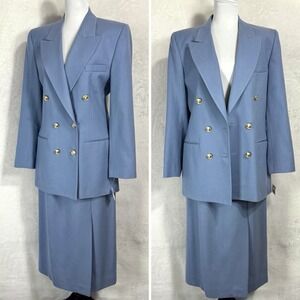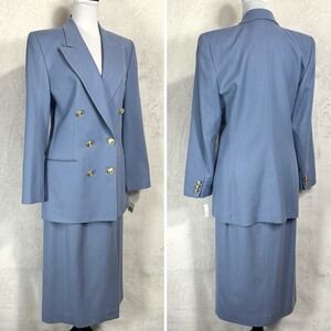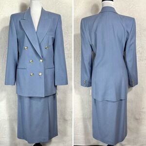 vintage talbots suit, wool skirt suit, periwinkle blue suit, made in usa, 80s power suit, double breasted blazer, gold button jacket, minimalist classic suit, old money style, career wear, business formal, wool office outfit, academia fashion, preppy vintage, cottagecore career, 90s workwear