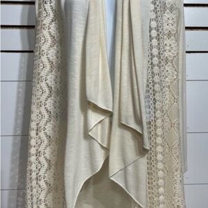 Ivory/cream colored lightweight knit cardigan. Waterfall lapels. Beautiful lace panels.