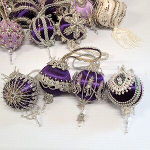 Vintage lot of 35 beaded sequin push pin satin Christmas Ornaments. Handmade from a kit (may be Cracker-Box) in purples, lavenders, and white with an attached ribbon for hanging. They are preowned in good condition. May have missing beads, sequins etc.