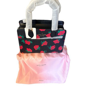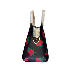 Kate Spade New York Madison Rose Toss Printed Medium Satchel. It is made from saffiano PVC with a black background and a red rose floral print. NWT!