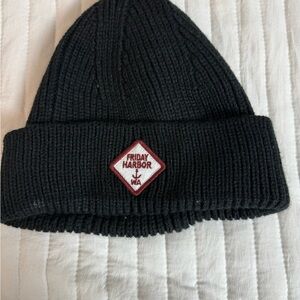 Cozy black knit beanie by Legacy featuring a minimalist Friday Harbor WA patch. Soft 100% acrylic material with a classic cuffed design that fits most. Perfect for winter outfits, casual streetwear, or travel style. Gently used and in great condition.