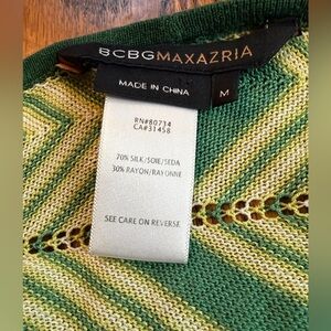 #BCBGMaxAzria #SilkBlend #GreenCardigan #ChevronStripes #EyeletDetail #AsymmetricalHem #HandkerchiefHem #LightweightLayers #ChicKnit #EUC