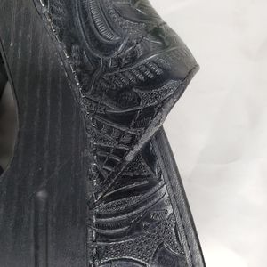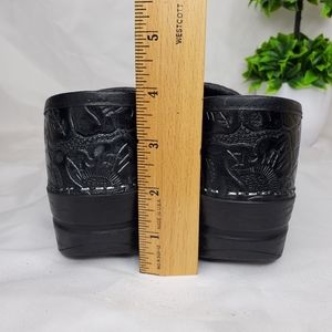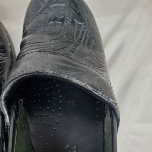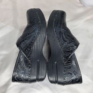Pre-owned Dansko Black Paisley Tooled Leather Womens Clogs Size 36. Womens work shoes with a platform sole, leather lined interior and paisley tooled leather. There is wear to the leather around the collar of the opening, otherwise I see no marks or scratches. Please refer to the photos.