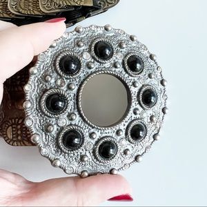 - Buckle decorated with circular onyx black beads surrounded by a braided edge, small metal beads, and rhinestones