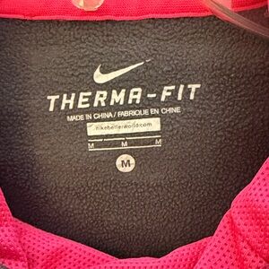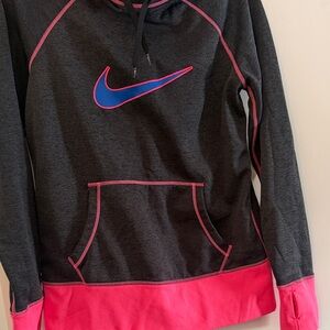 Nike pullover in charcoal with vibrant pink trim. Features a striking blue logo on the chest.