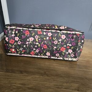 Stylish and spacious, this Kate Spade tote bag features a vibrant floral design on a black background. Perfect for adding a touch of elegance to any outfit. Great pre-owned condition. Clean inside and out. Only flaw noticed is in the last photo around the handle. The long strap is unavailable. Approximate dimensions are 12W x 8.3H x 4.5D.