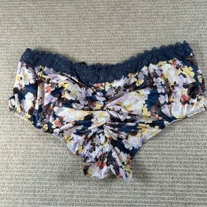 NWT Torrid Curve Cheeky Panties in sunshine floral print. Sheer comfortable stretch body with lace trim. 100% cotton lining. The standout feature is the ruched back detail, which creates a flattering, contoured silhouette.