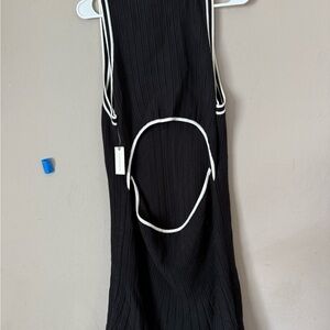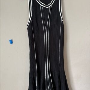 Chic black midi dress with white accents. Sleeveless design. Perfect for versatile styling. Stunning dress