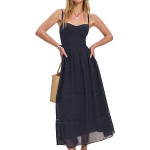 Chic navy midi dress with a fitted bodice. Features delicate straps and flowing skirt. Perfect for elegant outings.