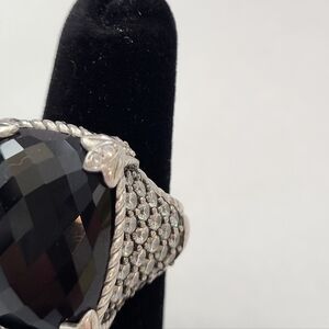This is the iconic Judith Ripka Monaco ring. It is stunning in person. It is in Perfect condition. All of the Diamonique stones on the sides are intact, and the Black onyx stone is perfect. It comes with the original pouch.