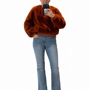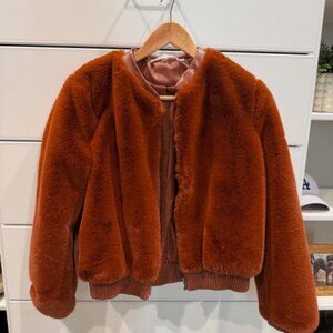 Soft faux fur jacket by ASTR The Label in cognac brown tones with faux leather trimmed edging on bottom of jacket and neckline. Purchased years ago in boutique store and only wore once.