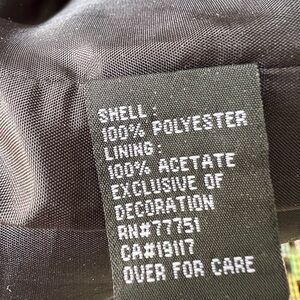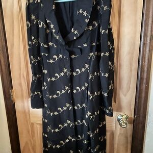 Too gorgeous! Black with glittery gold thread embroidery grosgrain ribbon waist with taffeta-like fabric. Two snap closure. Measures approximately 16” pit to pit and 42” shoulder to hem. Can be worn as a lightweight coat for an elegant evening. Or pair it with a cami and leggings and wear it as a duster. Super versatile and eye-catching.