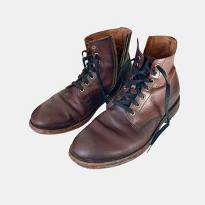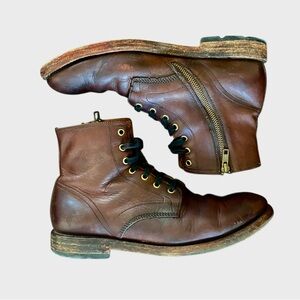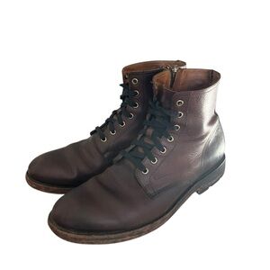 Frye Bowery Lace-Up Side-Zip boots in a men's size 9.5. These boots are crafted from premium antiqued leather that has a rich, multi-tonal brown finish designed to look better with every wear.
