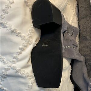 Chic gray boots with striking stud details. Perfect for a bold fashion statement.