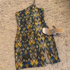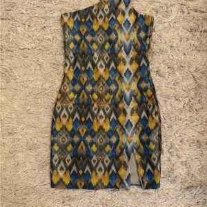 Chic one shoulder dress with geometric pattern. Vibrant blue, yellow, design. Perfect for a bold look. Gorgeous Dress!!!
