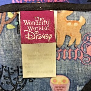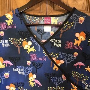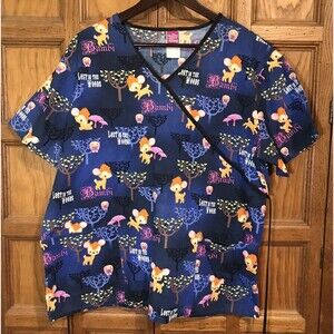 The Wonderful World of Disney Bambi, Lost in the Woods Scrubs. Women's size Large, Blue Multicolor, Back Tie Wrap, Side Vents, Short Sleeves, 2 Pockets Top. Scrubs for Nurse, Vet, Dental, Medical.