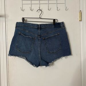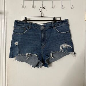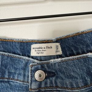 Classic Abercrombie & Fitch “The Mom Shorts” featuring a high-rise fit with a relaxed, vintage-inspired silhouette. Made from sturdy denim with a distressed finish, raw frayed hems, and light distressing throughout for that perfectly worn-in look.