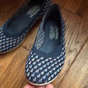 Step out in style with these chic navy and white patterned flats. Perfect for any occasion, these shoes offer both comfort and elegance.