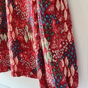 Loft Blouse M Red White Blue Long Sleeve Geometric Tie Neck Ruffle Boho Career