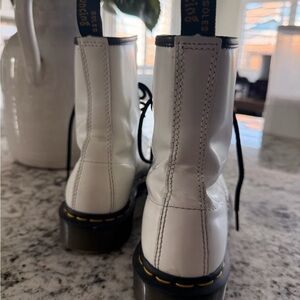 The 1460 is the original Dr. Martens boot. The boot's recognizable DNA looks like this: 8 eyes, grooved sides, a heel-loop, yellow stitching, and a comfortable, air-cushioned sole. This version has been built specifically with a woman's foot in mind, and comes in glossy, high shine leather.