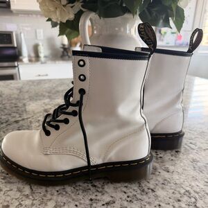 Chic gray lace-up boots with black eyelets. Iconic Dr. Martens style.