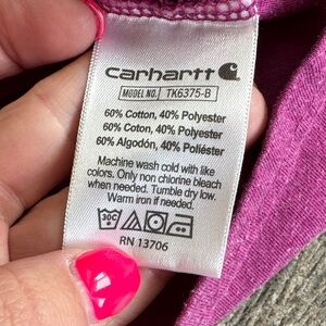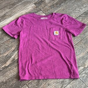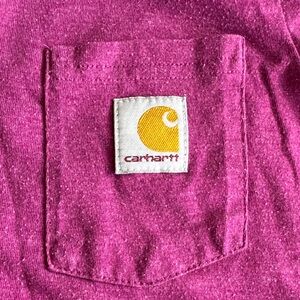 Stylish Carhartt tee with a handy chest pocket. Soft and comfortable for daily wear. Carhartt magenta color pocket tee boys size 7 gently used with general wash and wear some pilling (pictured) from wear clean smoke free home