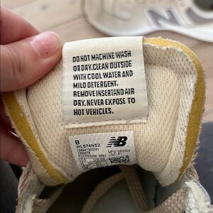 Comfortable sneakers with a light tan and brown color scheme. Features durable soles and signature New Balance logo.