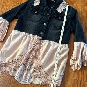 Adorable one of a kind reworked, upcycled denim jean jacket.