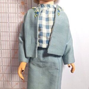 • Blue gingham top with embroidered suit- The checked shirt has holes from moths. There are a couple small holes in the jacket as well. The pictures clearly show these issues.