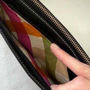 Large black leather wristlet by Kate Spade. Features a sleek design with a wrist strap and 2 zippy compartments. Can fit a smaller style IPhone inside. Some pealing on the side.