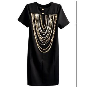 Chic black dress by Midnight Velvet featuring a stunning front drape of gold-tone chains and faux pearls for a bold, elegant look. Perfect for parties, dinners, or special occasions.