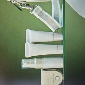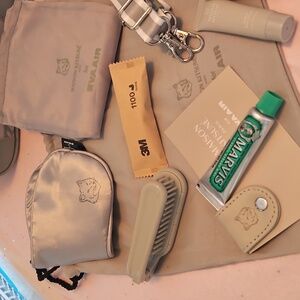 Stylish beige bag. Compact and versatile. Ideal for essentials, Travel accessories included, Ready for Travel and a bag when you get there..Please look at all the pictures and message me with any questions.. EVA AIR..fist time opened for photos. color, light sage green and beige.