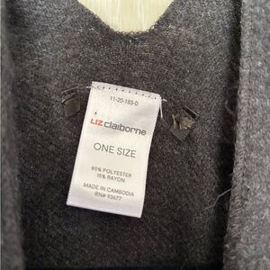 Upcycled Liz Claiborne shawl with two black denim stars and denim pockets on the front.