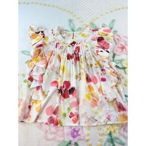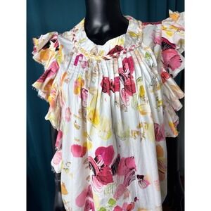 Keywords: Fairhope, Floral top, Ruffle sleeve, Pintuck, White top, Pink floral, Yellow floral, Spring top, Summer top, Casual top, Braided neckline, Women L