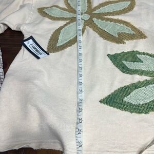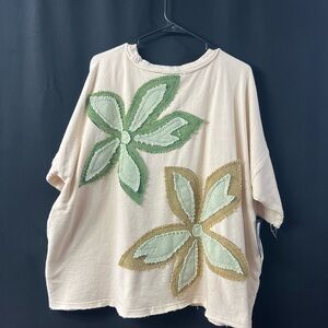 Charming tee with large floral patches. Soft cream fabric with green accents. Perfect for playful days. Beautiful Oli and Hali short sleeve top featuring large textured floral appliqué designs on both the front and back. Soft neutral cream base with oversized flowers in sage, olive, and mint tones. The raised stitching and dimensional appliqué give this top a hand-crafted, boutique look. Raw edge hem and sleeves add a relaxed, artsy finish. Comfortable, unique, and perfect for everyday wear or styling as a statement piece.