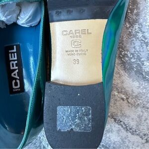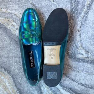The Ultimate Parisian Statement Shoe Up for sale is a rare, collector-grade pair of the iconic Carel Paris 2100 loafers. Since 1990, the 2100 has been a staple of the Carel collection, known for its "trotter" style that perfectly balances masculine & feminine lines. This specific pair features a stunning iridescent holographic finish that shifts through turquoise, emerald green, and deep violet as it catches the light.
