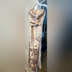 Chic strapless dress with floral design. Pale Pink base with elegant slit. Perfect for prom, formal, wedding, special occasions.