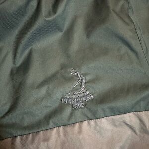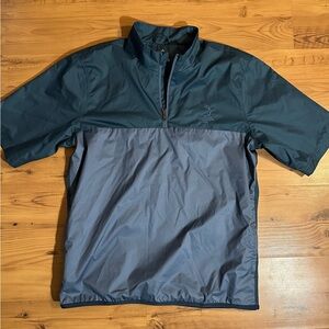 Two tone blue colorway. Legendary Pinehurst logo embroidered on the chest. This golf jacket is built with wind-resistant protection and seam-sealed details to help keep out the elements. The short sleeve style features a quarter zip with a stand-up collar for adjustable coverage all through your round. Blocks of color give it a standout look. See pictures for tags & measurements.