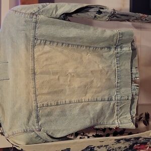 Bold denim jacket with colorful paint splatters. Unique and eye-catching design. Perfect for creative style.