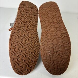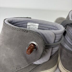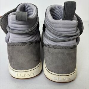 Comfortable rugged boots in a gray suede with stretchy fabric around ankle. Weather resistant and grooved outsole for traction.
