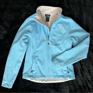 The North Face TNF Apex Jacket in Aqua Blue. Front zip. Hem cinch cord. Internal stretch cuffs. Two zip hand pockets. Zip chest pocket. Size S/P. Worn only a few times. Excellent condition.