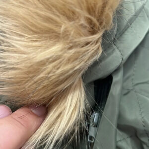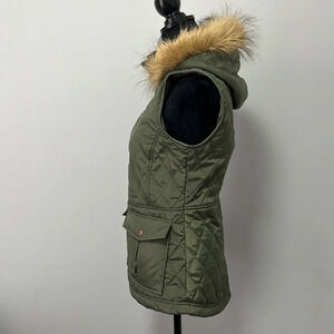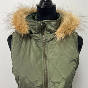 NWT Miami by Francesca’s Olive Puffer Quilted Jacket Hooded Vest size Small with detachable Faux Fur hood