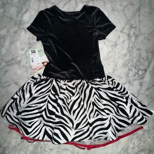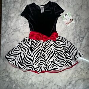 Charming kids costume by Bonnie Jean. Features a zebra print skirt and a bold red bow. Ideal for dance and play.