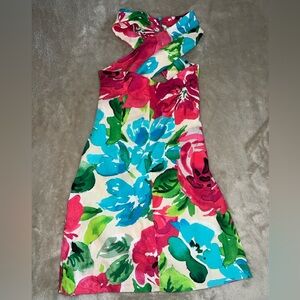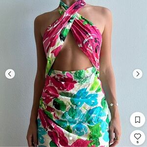 Bold backless dress with vibrant floral patterns. Perfect for sunny days.
