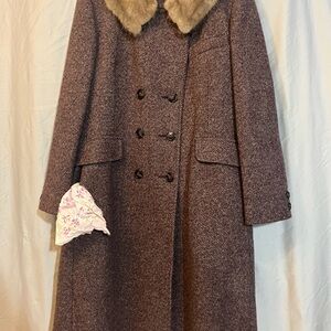 Beautiful Wonkers union made coat 100% wool with burgundy liner no signs of wear. Fur is in excellent condition. Vintage handkerchief found in the pocket. This coat is a stunner and true collectors piece. Will fit a small or medium.