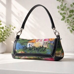 This cute Saks Pink Label casual clutch bag is in wonderful condition. Canvas has Multi-color Palm Trees and Houses In Tropical Watercolor Look. Black Leather trim small 5.5" H x 12" L. Magnetic closure and detachable leather strap for convenience to carry as a clutch. No stains and leather in perfect shape.