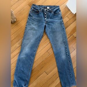 Classic Vintage Levi 501’s mid blue wash. Tag says 29 x 34. These are a gem, it’s hard to find authentic vintage 501’s with a 34 inseam. They’re usually so short in good vintage condition. These have no flaws are literally perfect I just never wear them because I have 100 jeans.