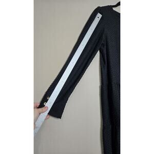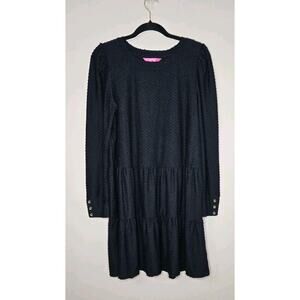 The product is a Lilly Pulitzer women's long sleeve dress in a size large, featuring a black Swiss dot design. It falls under the designer theme and is perfect for those looking for a stylish and feminine piece to add to their wardrobe. The dress offers a classic yet trendy look with its long sleeves and sophisticated black color, making it versatile for various occasions. Perfect for a day out or a special event, this Lilly Pulitzer dress combines comfort and elegance effortlessly.