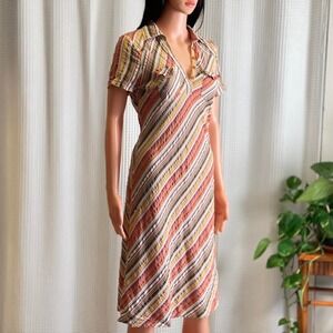 Orange Striped Collared Short Sleeve Shirt Dress Knee Length Retro Boho Size S