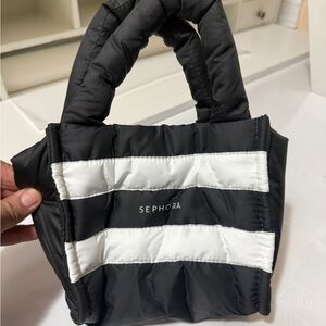 Stylish and versatile, the Sephora quilted tote bag is perfect for everyday use. Featuring a chic black and white design, this bag adds a touch of elegance to any outfit. Ideal for carrying your essentials with ease.
